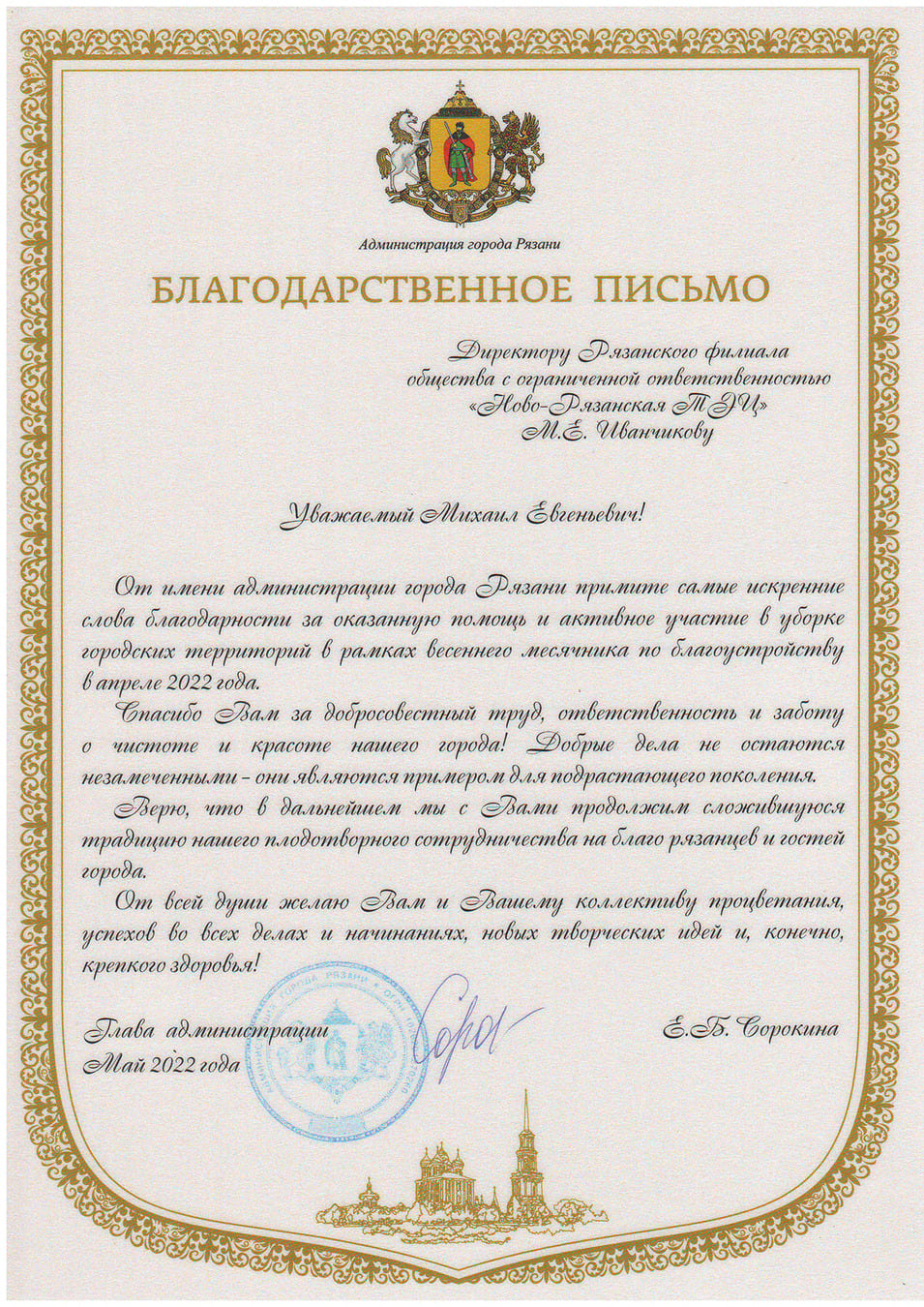 Глава администрации Рязани Елена Сорокина вручила Ново-Рязанской ТЭЦ благодарственное письмо за помощь в уборке города