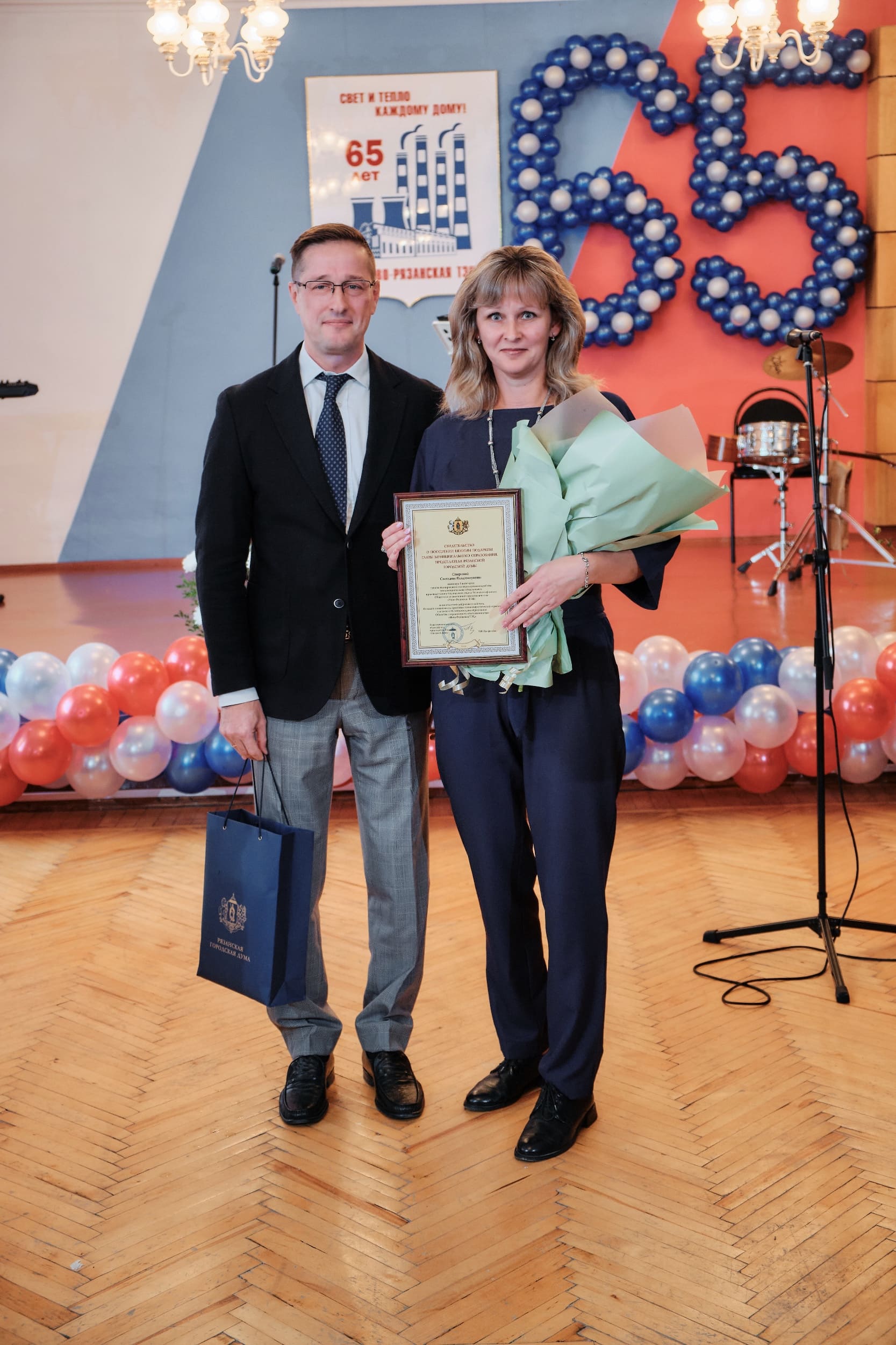 Продолжил награждение исполняющий обязанности главы муниципального образования, председателя Рязанской городской Думы Антон Астафьев, поздравив присутствующих с юбилеем от имени депутатов городской Думы. Он выразил благодарность коллективу «за работу и за вклад в развитие станции, в будущее». От Рязанской городской Думы он объявил благодарность начальнику смены электрического цеха Вадиму Наумову, токарю цеха ремонта тепломеханического оборудования Олегу Строкову, вручил ценные подарки инженеру производственно-технического отдела Светлане Спириной, инженеру отдела сертификации и систем менеджмента Ирине Новиковой.