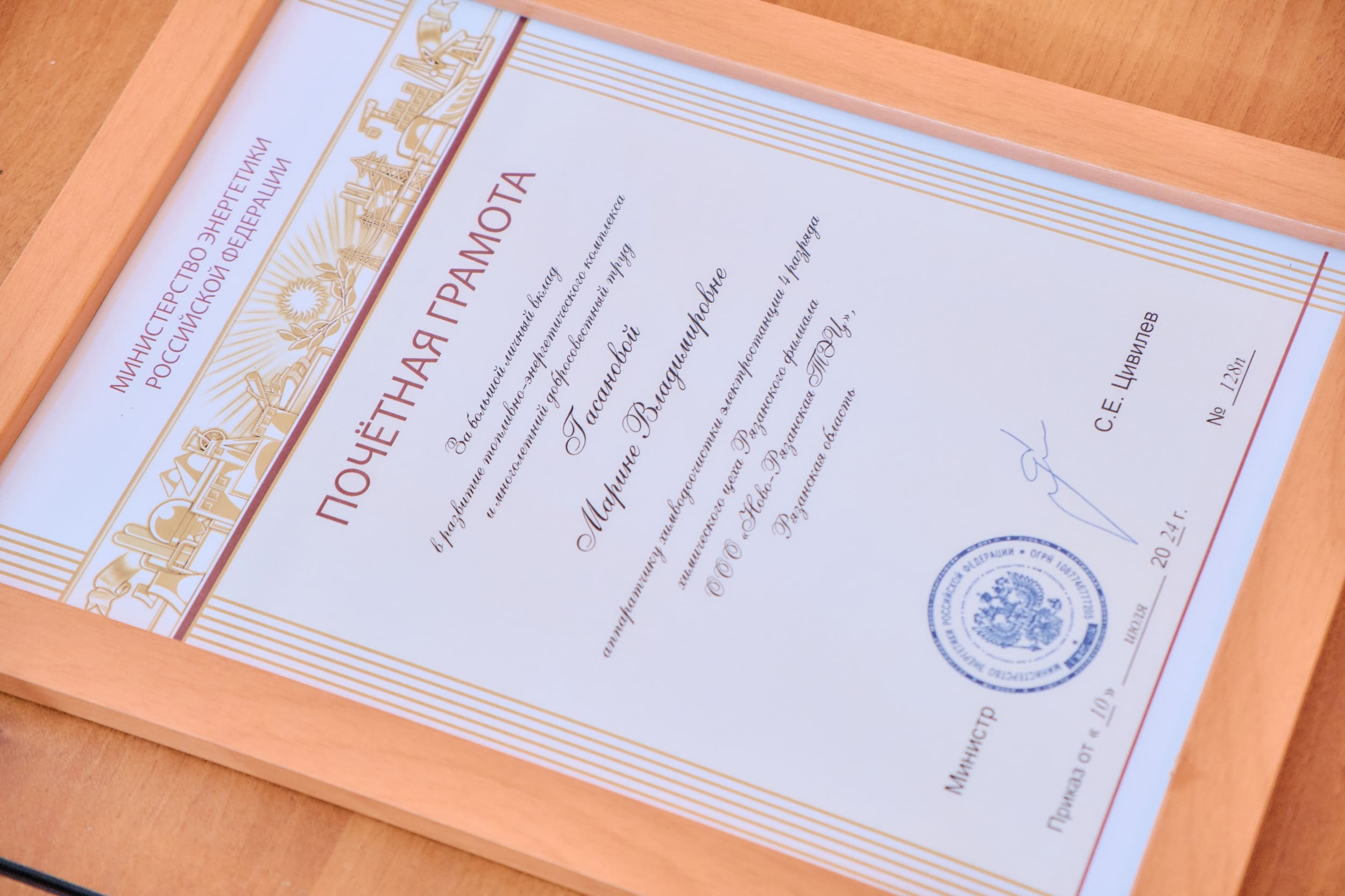 Почётной грамотой Рязанского филиала ООО «Ново-Рязанская ТЭЦ» и денежной премией награждены: