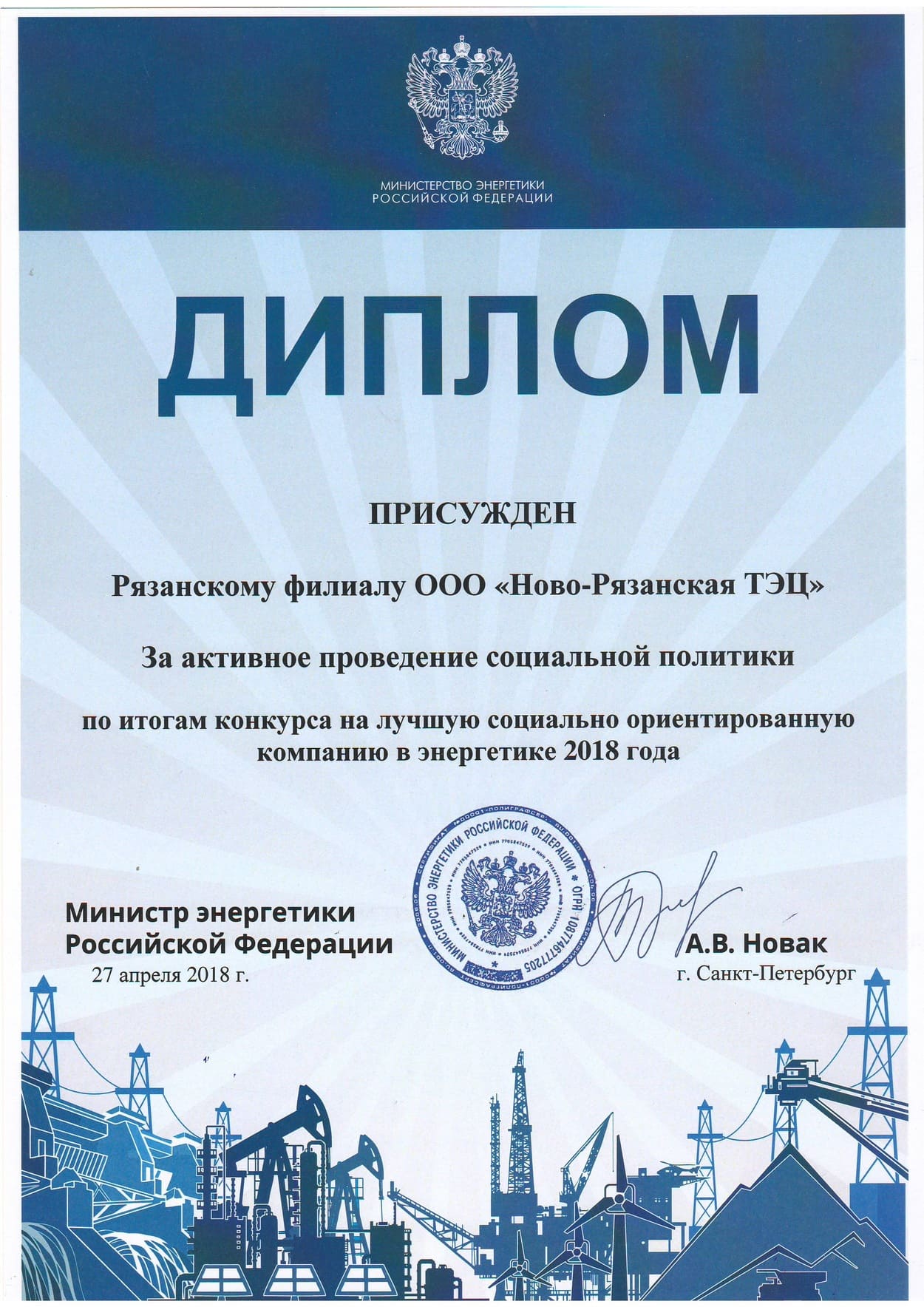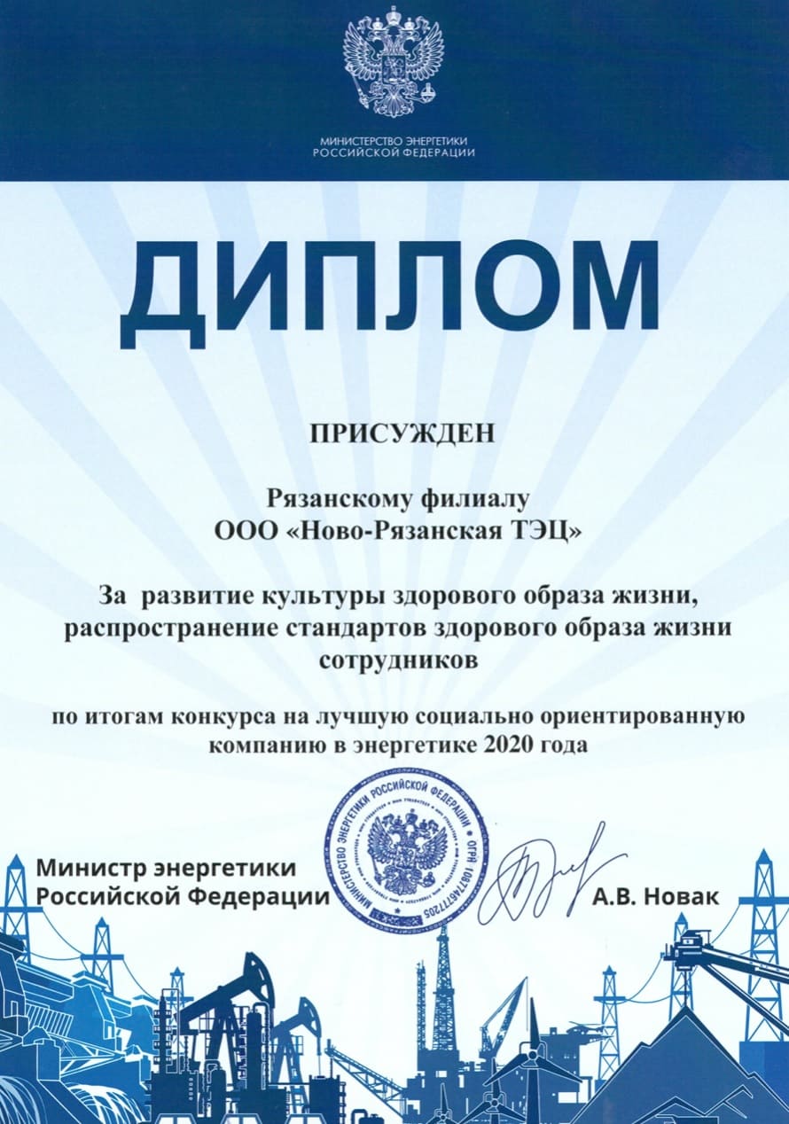 Ново-Рязанская ТЭЦ признана победителем всероссийского конкурса Министерства энергетики РФ на звание «Лучшая социально ориентированная компания в энергетике 2020 г.» в номинации «Развитие культуры здорового образа жизни, распространение стандартов здорового образа жизни сотрудников» с численностью персонала до 1 тыс. человек.В конкурсе принимало участие 67 крупнейших предприятий отрасли, определены победители в 11 номинациях и выделены 16 лучших проектов. Это не первая награда, которую присуждает станции Минэнерго России по итогам ежегодного конкурса, - в 2018 году ТЭЦ была отмечена дипломом министерства за активное проведение социальной политики в трудовом коллективе.
