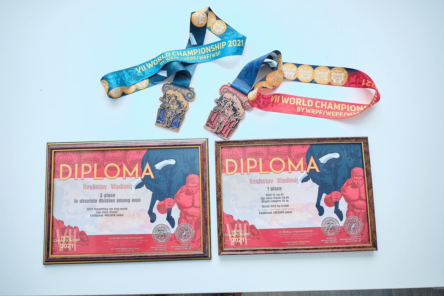 А вот в декабре 2021 года Владимир Решетов уже стал чемпионом мира по пауэрлифтингу, силовому двоеборью, жиму лежа, народному жиму, становой тяге по версиям WRPF/WEPF/WAF/WSF в номинации «пауэрлифтинг без экипировки ДК» в классе Мастера возрастной группы 40-49 лет и весовой категории 90 кг с суммарным результатом 647,5 кг. По своей группе он стал золотым медалистом, а в абсолютном зачете занял 3-е место. Алексей же выступил в роли тренера брата.