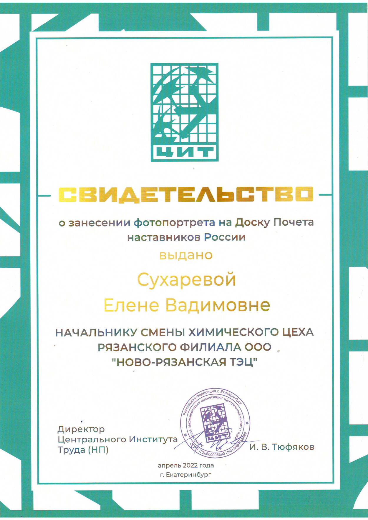 Начальник смены химического цеха Ново-Рязанской ТЭЦ Елена Сухарева вошла в число лучших наставников России. Ее фотопортрет занесен на Доску почета наставников Российской Федерации ( https://www.cit.org.ru/kopiya-proekty). Инициатором проекта по созданию в сети Всероссийской Доски почета выступил Центральный институт труда с целью поддержки трудовых коллективов предприятий и организаций и возрождения движения наставничества в стране. Сегодня на сайте «Доска Почета наставников России» размещены фотопортреты наставников, представляющие более 700 предприятий из 72 регионов нашей страны. В ноябре 2021 года выдвижение работников рязанских предприятий на Доску почета наставников России поддержало правительство Рязанской области.