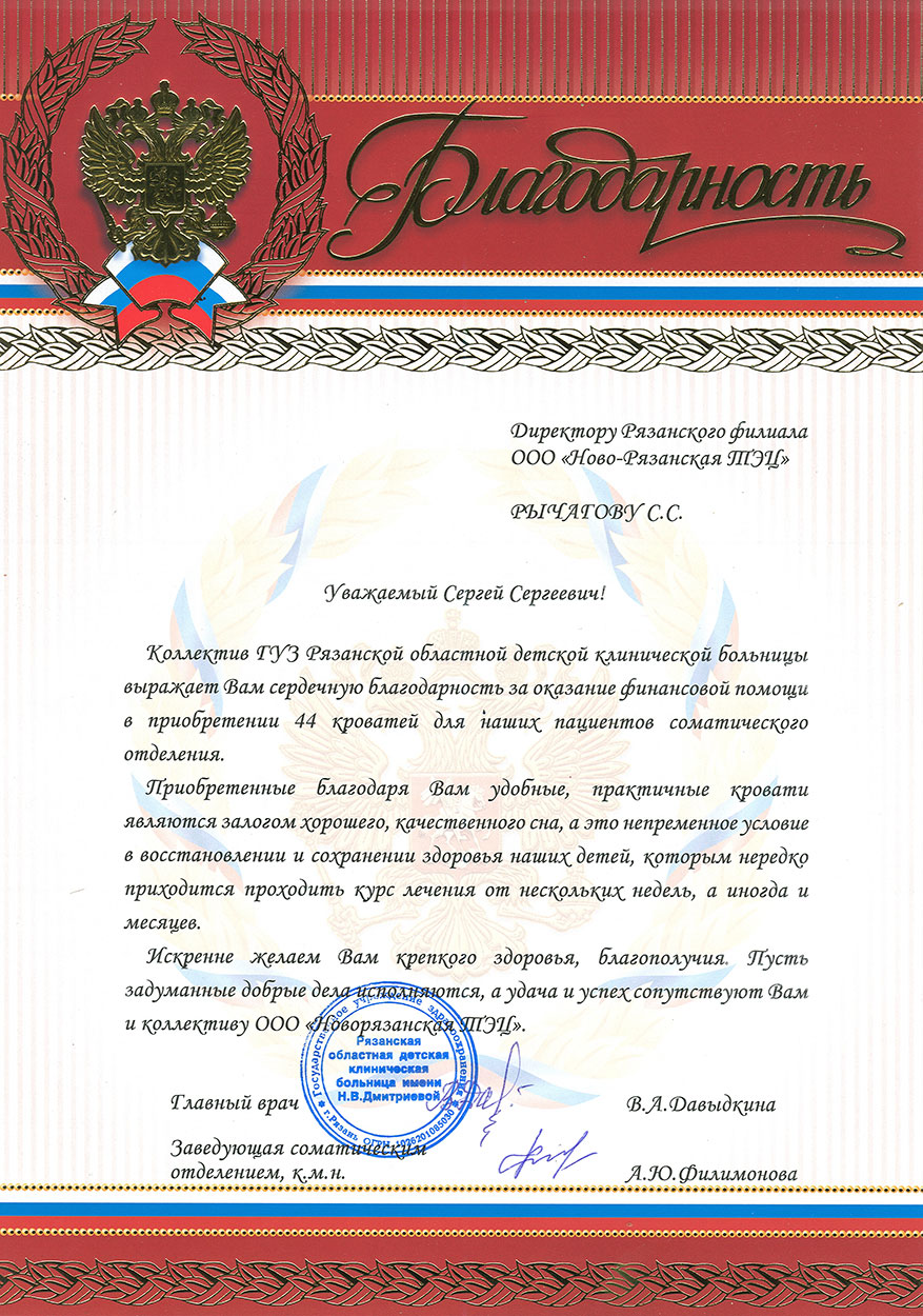 В знак признательности главный врач больницы передала руководству Ново-Рязанской ТЭЦ благодарственное письмо, а дети к приезду «шефов» подготовили рисунки, на которых энергетики — главные действующие лица. Рисунки с творчеством детей размещены на корпоративном сайте Ново-Рязанской ТЭЦ.